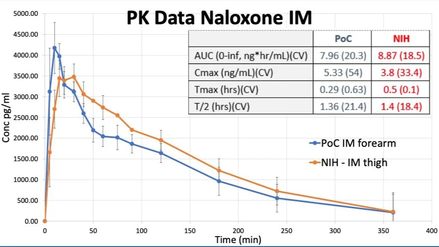 IM administration of naloxone into the dorsal FOREARM muscle has a PK profile approximately equivalent to IM injection into the thigh, setting the stage for a new convenient IM device.